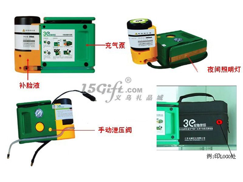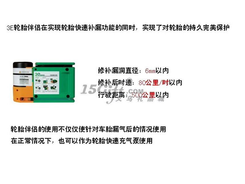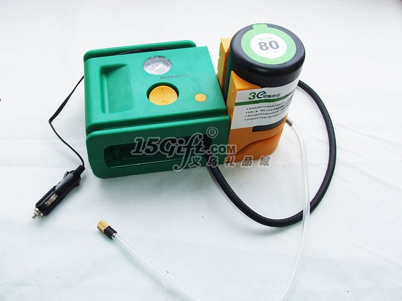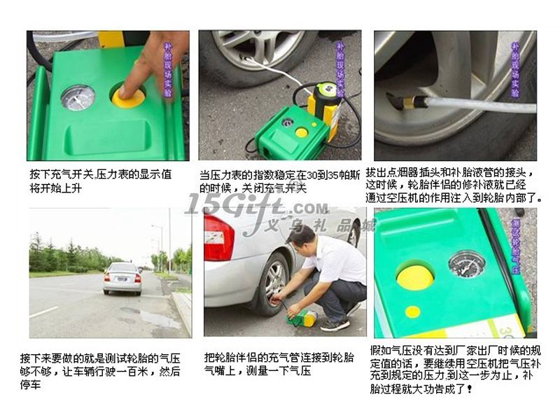操作方法:第一步:將點(diǎn)煙器插頭插入12V的車載電源插座,發(fā)動汽車。第二步:1、拿出補(bǔ)胎液管。2、順時(shí)針方向擰轉(zhuǎn)空壓機(jī),使其與補(bǔ)胎液瓶成90度垂直。3、取出充氣管,將充氣管接頭與補(bǔ)胎液系統(tǒng)接頭相連。3、將補(bǔ)胎液管接頭接至輪胎氣嘴,確保二者連接到位。第三步:1、按下開關(guān),使之處于開啟(Ⅰ)位置,壓力表的顯示值將開始上升。在補(bǔ)胎液通過的過程中,壓力超過40PSI屬于正?,F(xiàn)象,當(dāng)補(bǔ)胎液完全進(jìn)入輪胎后,壓力顯示將反映實(shí)際胎壓。2、盡量確保您停機(jī)后壓力表的顯示值會穩(wěn)定于30PSI以上。警告:如果壓力表的顯示值始終無法超過20PSI,說明輪胎受損過于嚴(yán)重,采用本機(jī)無法修復(fù),請速與專業(yè)維修店聯(lián)系。第四步:1、當(dāng)壓力表穩(wěn)定于30PSI以上時(shí),關(guān)閉空壓機(jī)。2、拔出點(diǎn)煙器插頭,分離補(bǔ)胎液管接頭,將本機(jī)重新放回原處。3、將車輛開動百米左右后,停車測量氣壓。如氣壓不夠,應(yīng)將氣壓補(bǔ)充到汽車生產(chǎn)廠家規(guī)定的壓力。注意:補(bǔ)胎后的行駛時(shí)速不得高于80公里。