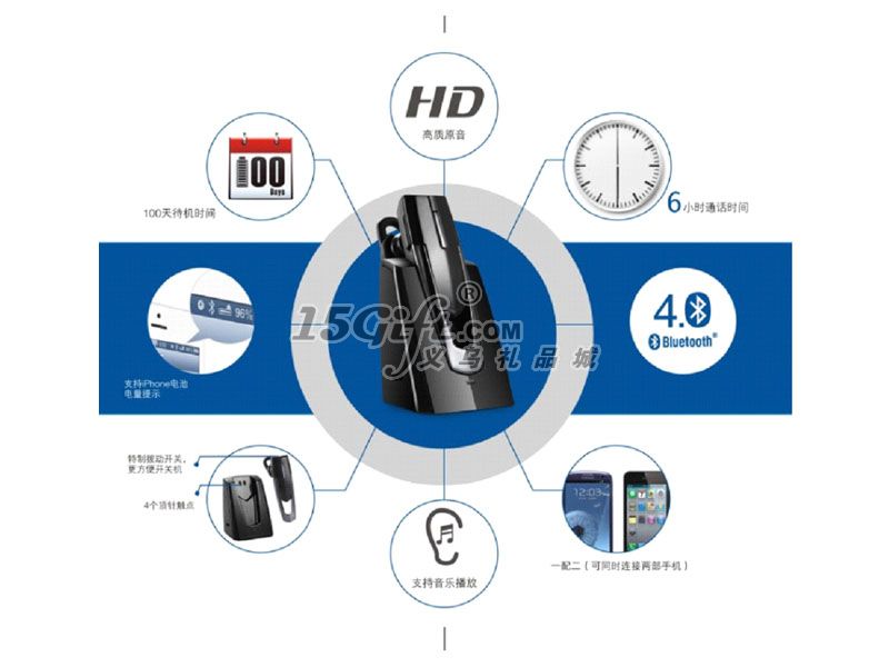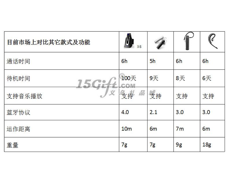 1. 6小時(shí) 通話時(shí)間2. 10米 通話距離3.100天 待機(jī)時(shí)間4.支持單聲音樂播放5.數(shù)碼信號(hào)處理降噪