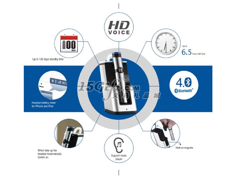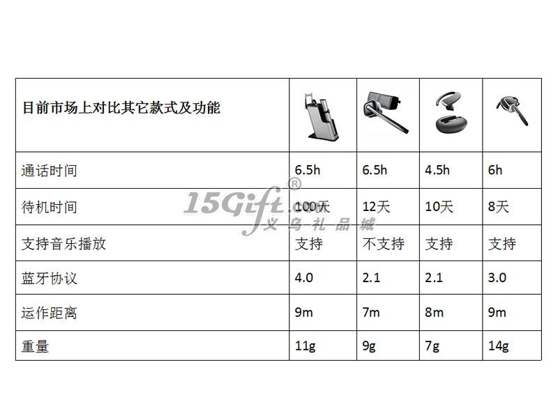 1. 7小時 通話時間2. 10米 通話距離3.100天 待機(jī)時間4.支持單聲音樂播放5.數(shù)碼信號處理降噪